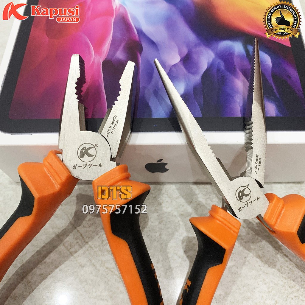Bộ 2 kìm điện, kìm nhọn công nghiệp kiểu Nhật Kapusi JAPAN 7 inch, thép Niken cao cấp, thiết kế tiết kiệm 30% lực bấm