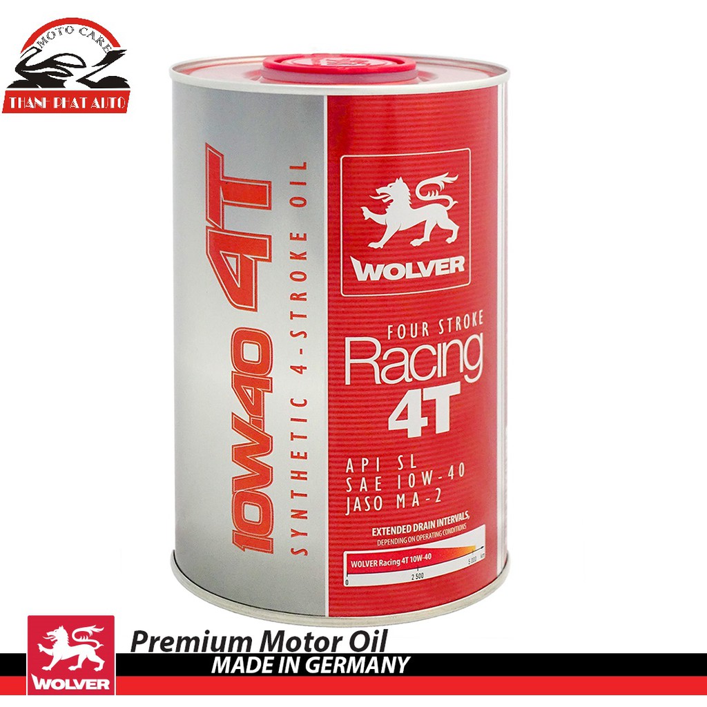 - Nhớt Wolver Racing 4T tổng hợp 10W40 ứng dụng công nghệ tổng hợp hoàn hảo được nhập khẩu từ Đức. với công thức pha chế phụ gia đủ tiêu chuẩn, có thể đáp ứng các yêu cầu kỹ thuật của những thế hệ động cơ đời mới nhất, với tính năng bảo vệ chống mài mòn, chống giảm áp suất dầu và hiện tượng oxy hóa ở nhiệt độ cao.