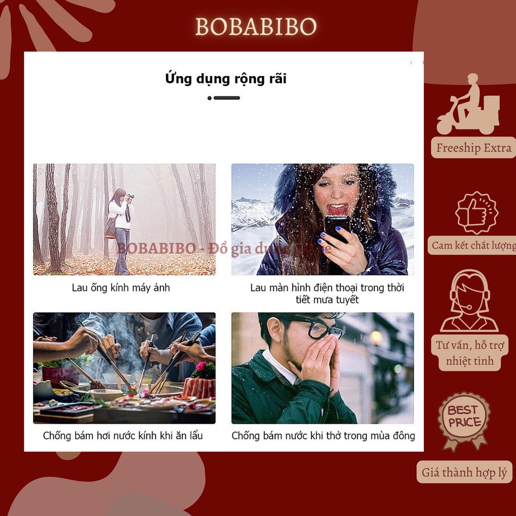 - Chuyên trị sương mù đọng trên kính, hơi nước trong môi trường máy lạnh, bám hơi nước trong hơi thở khi đeo khẩu trang