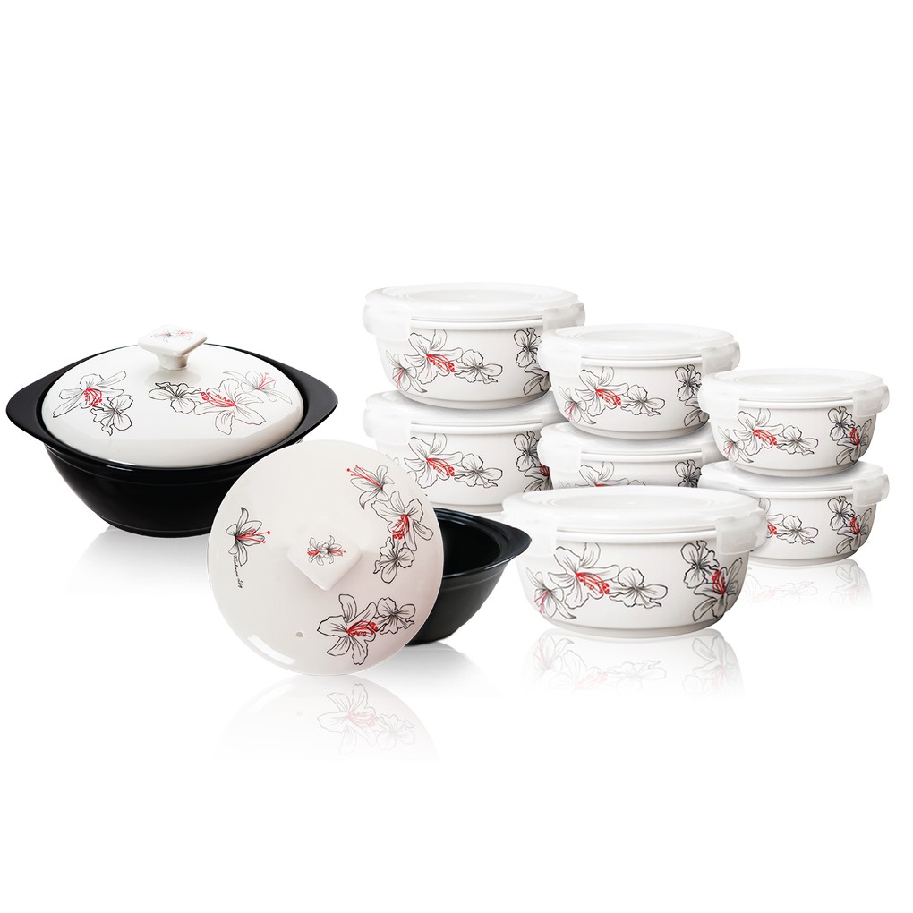 - Bộ 2 nồi đất và 7 thố sứ cao cấp Hoa Ly Donghwa LG CSB1505S9HE đựng thức ăn tiện dụng có kiểu dáng bắt mắt với gam màu và họa tiết tinh tế, thiết kế dành riêng cho gia đình Việt Nam với gờ chén đặc biệt, tiện cho việc cầm nắm và sử dụng trong các bữa ăn Việt, tô điểm thêm cho không gian bếp nhà bạn.