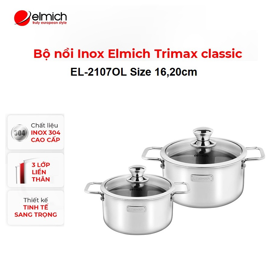 Giới thiệu Bộ 2 nồi inox 304 cao cấp 3 đáy từ liền nguyên khối Elmich Trimax Classic EL-2107OL Size 16, 20cm
