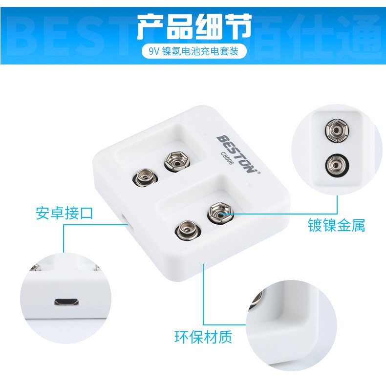 - Bộ sạc BESTON hỗ trợ sạc tới 2 viên pin sạc 9V, tự ngắt khi đầy pin cực an toàn cho pin. Bộ sạc gọn nhẹ, tiện dụng, dễ dàng mang theo đi du lịch.Thiết kế thông minh, hạn chế tối đa việc gắn ngược pin, ngăn hư hại cho pin và thiết bị sạc.