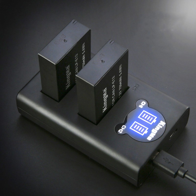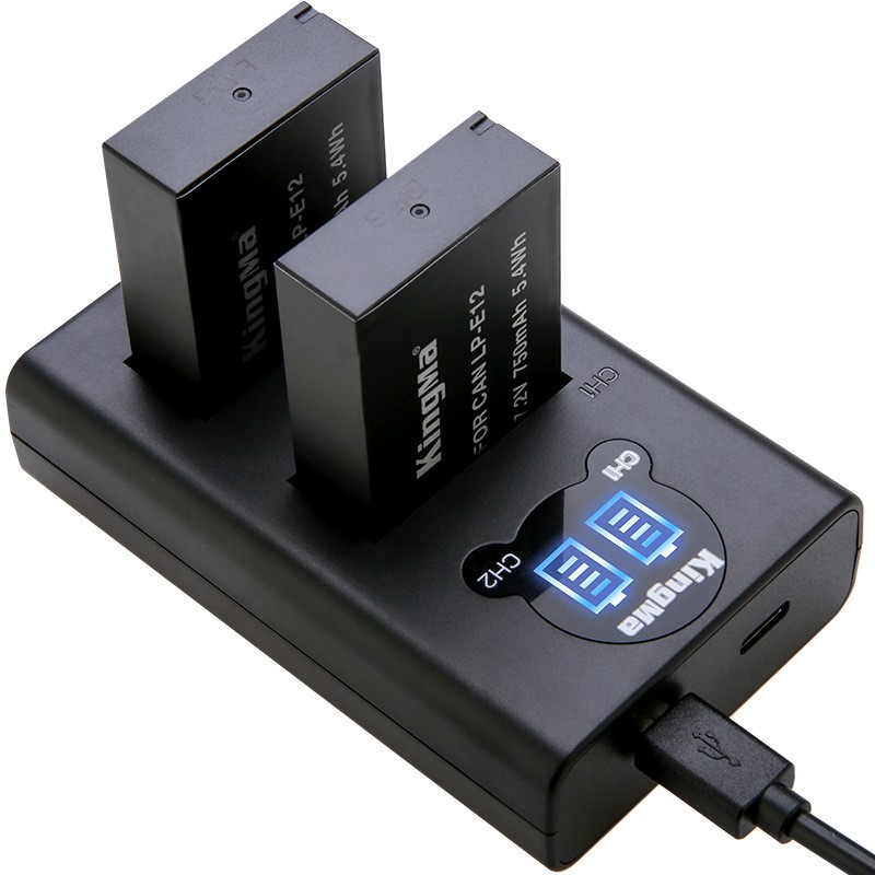 Bộ sản phẩm bao gồm sạc pin đôi đèn led cho LP-E12 + 2 Pin KingMa 750mAh + 2 hộp đựng pin/thẻ nhớ + 1 dây cáp Type CPhù hợp với nhiều loại máy ảnh Canon M10 100D EOS Rebel S1 M M2 M50 M100 M200