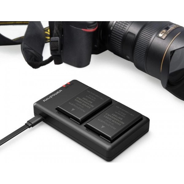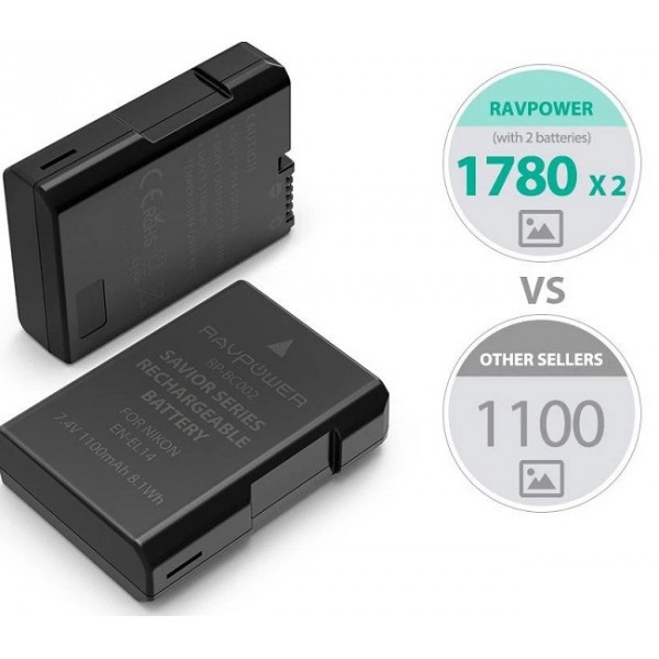 Bộ 2 pin + sạc RAVPower EN-EL14 for Nikon D3100, D3200, D3300, D3400, D5100, D5200, D5300, D5500, D5600