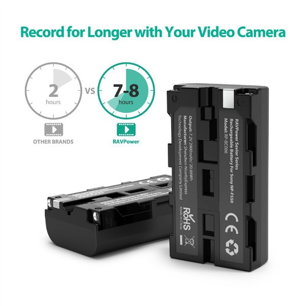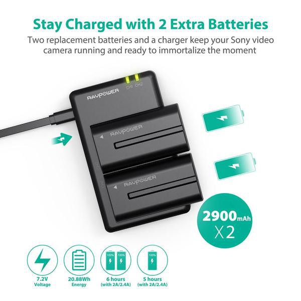 * Bộ 2 pin và sạc đôi RAVPower Sony NP-F550 có thiết kế nhỏ gọn, phù hợp để bạn bỏ vào trong túi, cặp, balo để mang theo đi khắp mọi nơi. Đây là một phụ kiện không thể thiếu dành cho những người sở hữu cho mình một chiếc máy quay. Bộ sản phẩm với 2 pin thay thế với dung lượng lớn hơn là 2900mAh, nhiều hơn so với pin theo máy chỉ có 2200mAh và bộ sạc khe kép giúp cùng lúc sạc đầy 2 pin. Trong thời gian sử dụng thực tế, bạn có thể sử dụng lên đến 4 giờ quay video mỗi pin trong khi những pin khác chỉ kéo dài trong 2 giờ do đó bạn sẽ có nhiều thời gian hơn để ghi lại những khoảnh khắc đặc biệt của cuộc sống.
