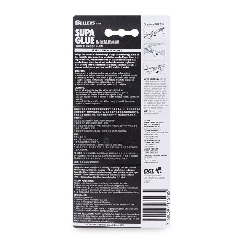 Keo dán đa năng Selleys Supa Glue thích hợp sử dụng trên các vật liệu kim loại, nhựa, gỗ, không kết dính vĩnh viễn thủy tinh hoặc vật liệu có chứa các yếu tố kiềm. Không nên dùng trong việc sửa chữa các dụng cụ có chứa chất lỏng nóng.