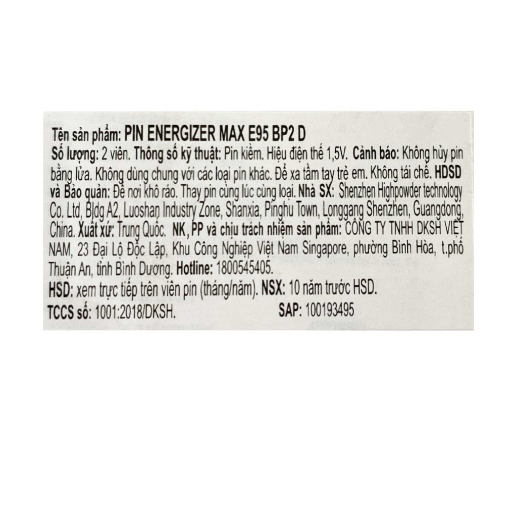 Pin Energizer Đại E95 chất liệu alkaline. Pin của hãng Energizer thế hệ mới sản xuất dưới công nghệ cao của Mỹ làm cho chất lượng của pin được nâng cao hơn thế hệ cũ. Trong các cỡ pin thì có pin đại D LR20.Pin đại D được sử dụng cho các thiết bị như đài, bếp gas, máy thiết bị công nghiệp, máy thiết bị y tế,...