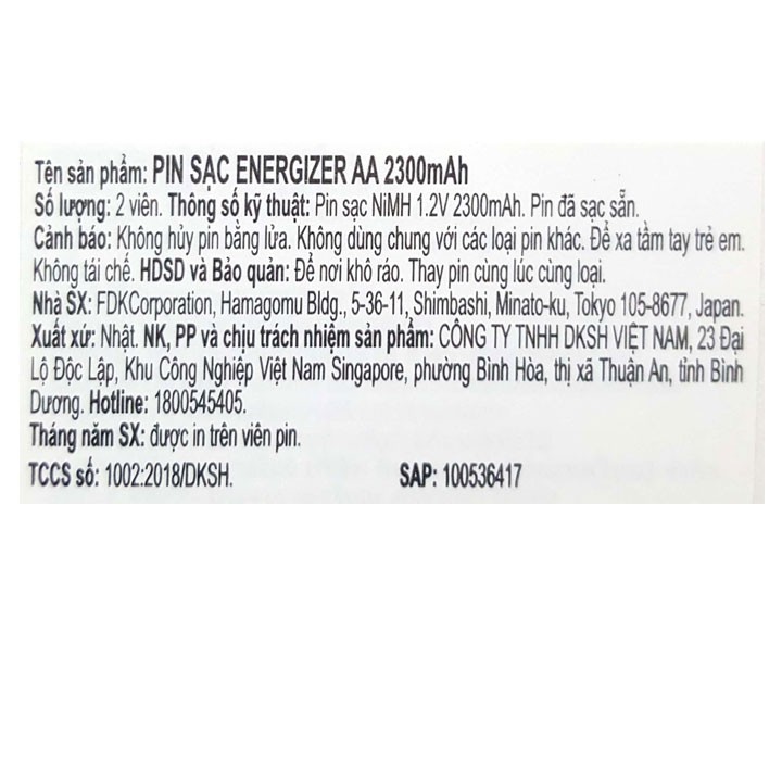 Energizer sạc AA 2300mah là dòng pin sạc có dung lượng cao nhất của hãng Energizer hiện nay. Pin sạc tiểu hay pin sạc aa phù hợp với các thiết bị như máy ảnh, máy đo huyết áp, cửa từ, điều khiển, chuột máy tính, mic hát, đồ chơi,...