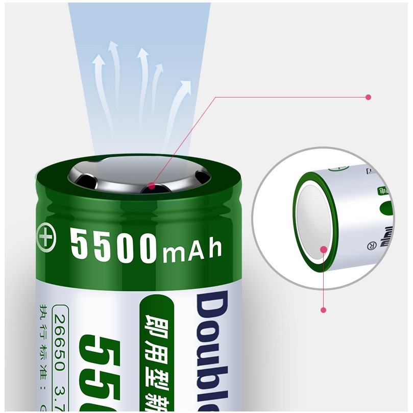 Pin Sạc Dung Lượng Cao 26650 3.7V 5500mAhtự động ngắt điện khi pin đã quá yếu, do đó tuổi thọ của pin bền gấp 2-3 lần so với pin bình thường. Có màng bảo vệ bên ngoài, chống va đập mạnh, bền hơn 500 lần so với pin bình thường