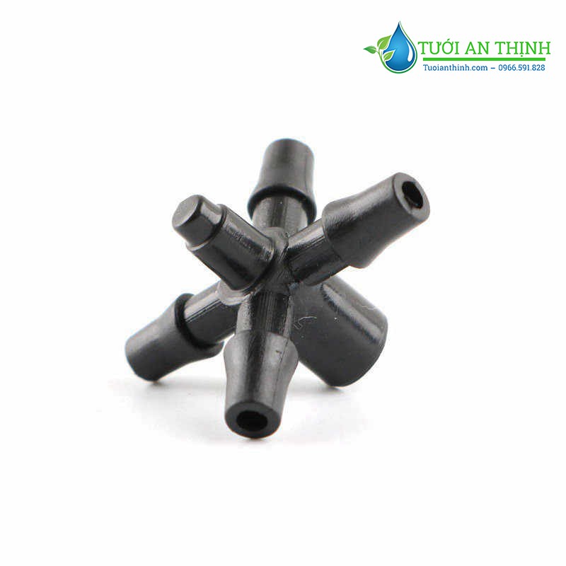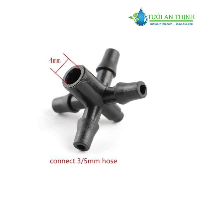 Ứng dụng: Chia 4 ống 5mm được sử dụng trong bộ 4 que tưới nhỏ giọt. 1 đầu cái kết nối với bù áp, 4 đầu gờ còn lại kết nối với ống mềm 5mm để nối ra que tưới nhỏ giọt.