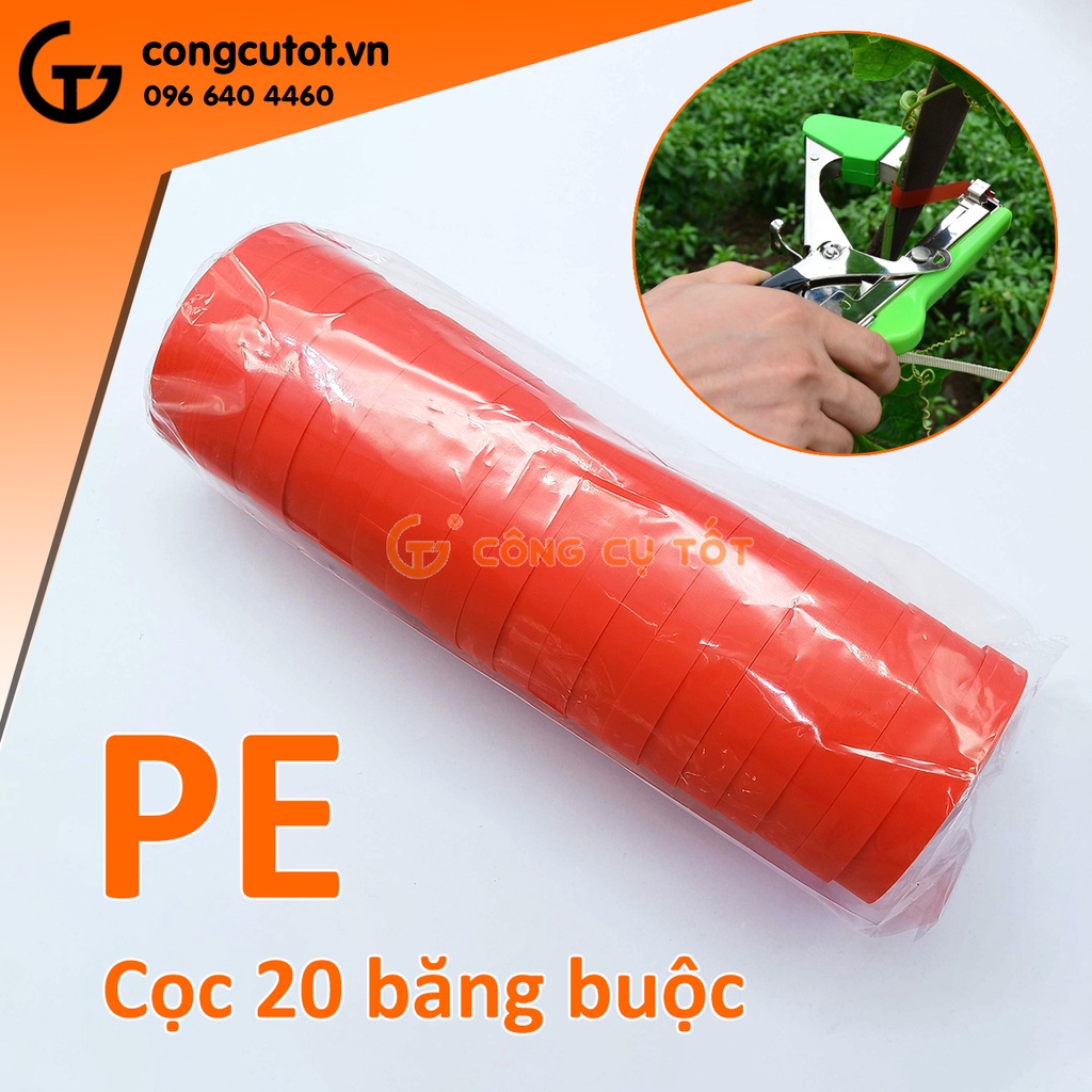 Combo 20 cuộn băng buộc cành chất liệu nhựa PEBăng buộc cành cây làm từ màng nhựa PE giúp cho mối buộc cành các ây dây leo nho, cà chua, hoa hồng vào giá đỡ vừa thẩm mỹ, vừa có khả năng co dãn khi cây lớn. Ngoài ra, băng cũng có thể lắp vào các dụng cụ buộc cành cây chuyên dụng.