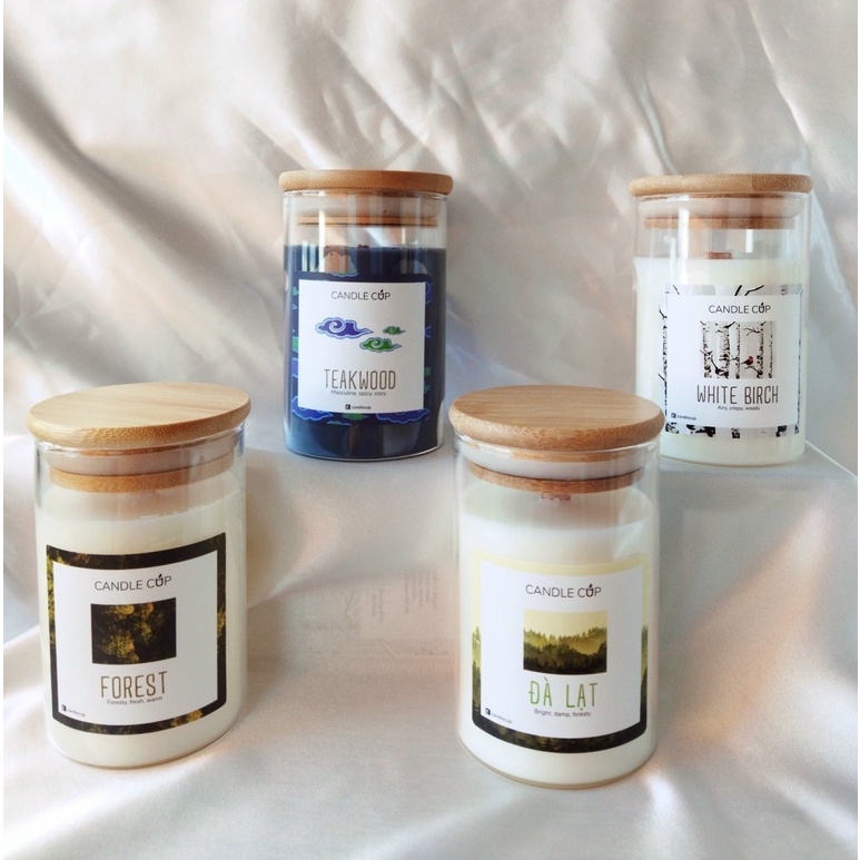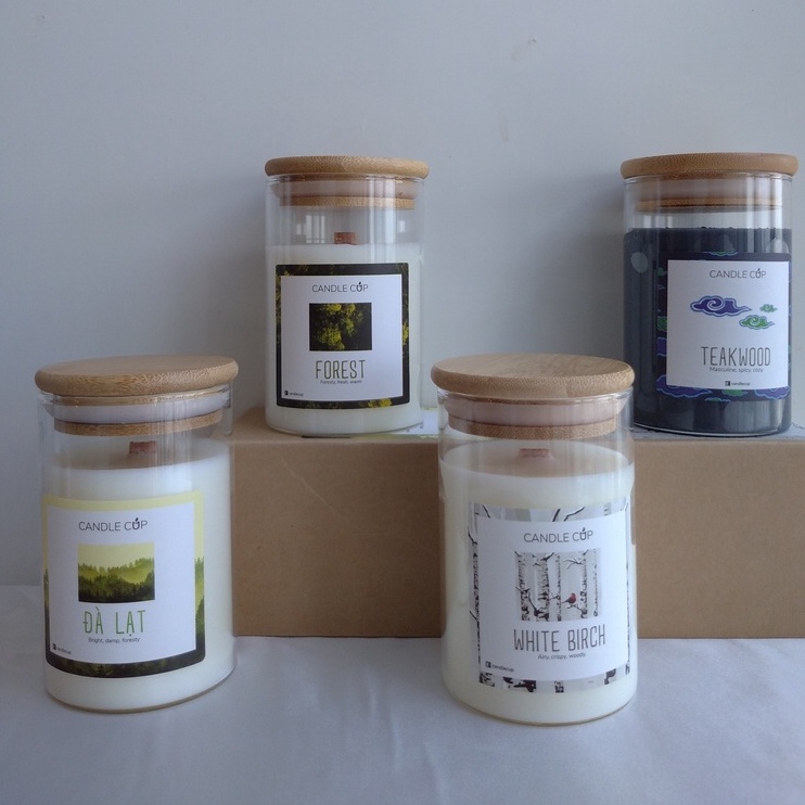 **350gr (nắp tre, bấc gỗ, ~75h cháy – không gian 30m2)
