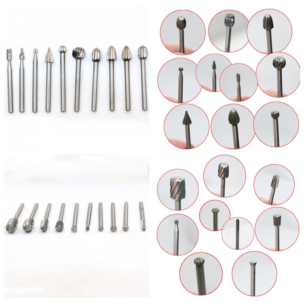 Bộ sản phẩm gồm 20 mũi khắc, mài, làm lũa, chạm trổ cao cấp dùng để tạo hình, tạo lỗ, rạch khía, làm khe, đục đẽo trên gỗ, kim loại, được làm từ kim loại HSS có độ cứng, sắc và độ bền cơ học cực cao
