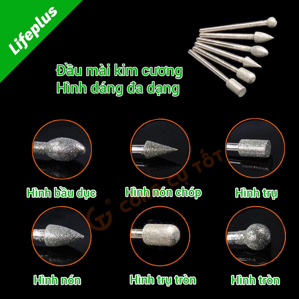 Hình dáng 6 loại đầu mũi mài: hình tròn (3 mũi), hình trụ (4 mũi), hình bầu dục (3 mũi), hình nón (3 mũi), hình nón chóp (3 mũi), hình trụ đầu tròn (4 mũi)