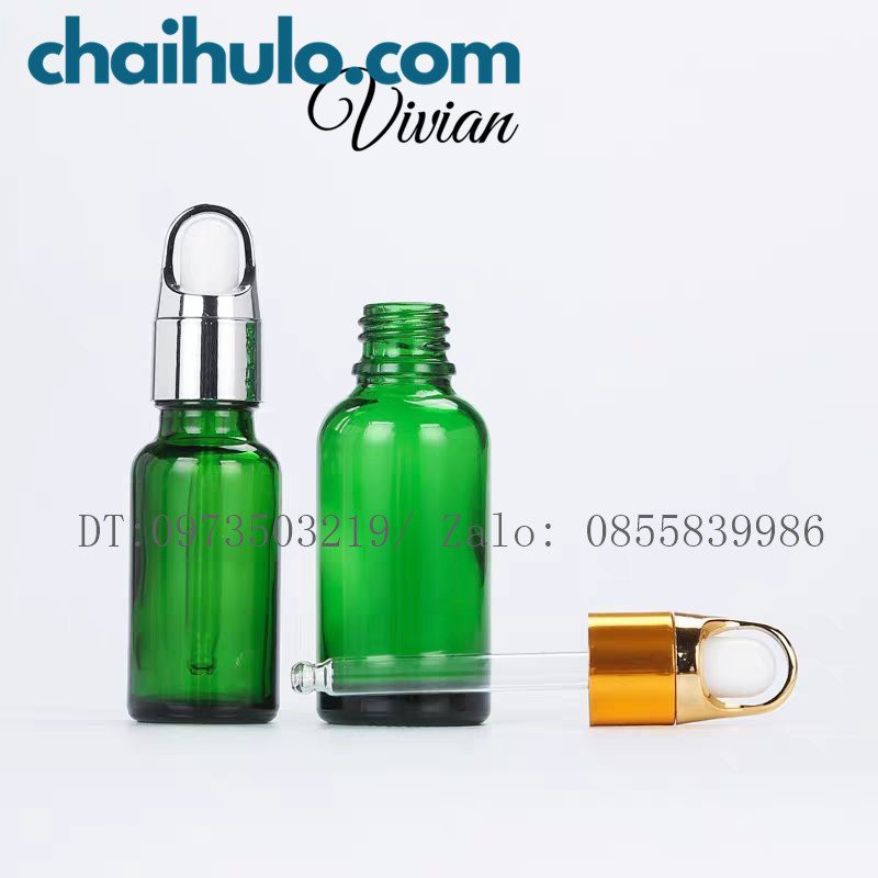 Giới thiệu 20ml - Chai lọ đựng serum, tinh dầu, mỹ phẩm, thân thủy tinh xanh lá, nắp bóp khoét