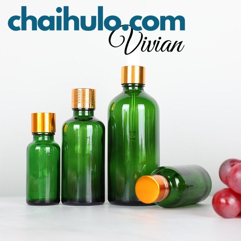 Giới thiệu 20ml - Lọ thủy tinh, lọ đựng tinh dầu serum thân xanh lá nắp vặn nhôm vàng trơn nhỏ giọt