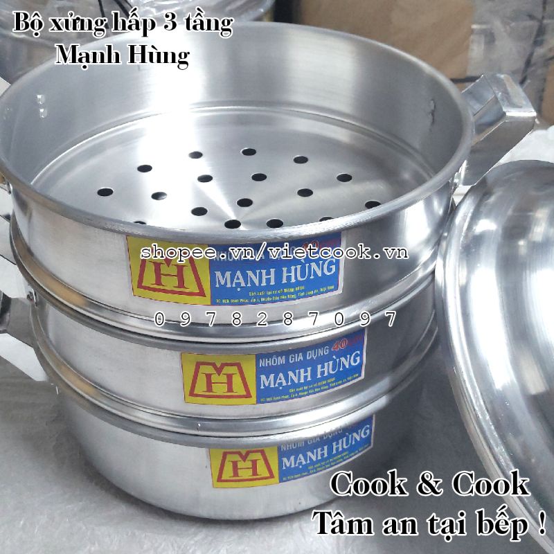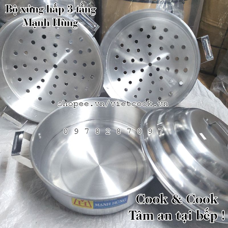 Nhà cửa & Đời sống > Dụng cụ nhà bếp > Nồi || [3.3 Sale] Bộ xửng hấp bánh bao, hấp xôi size 40 cm nhôm Mạnh Hùng 2, 3 tầng hấp xôi, hấp bánh bao, hấp hải sản...Còn hàng