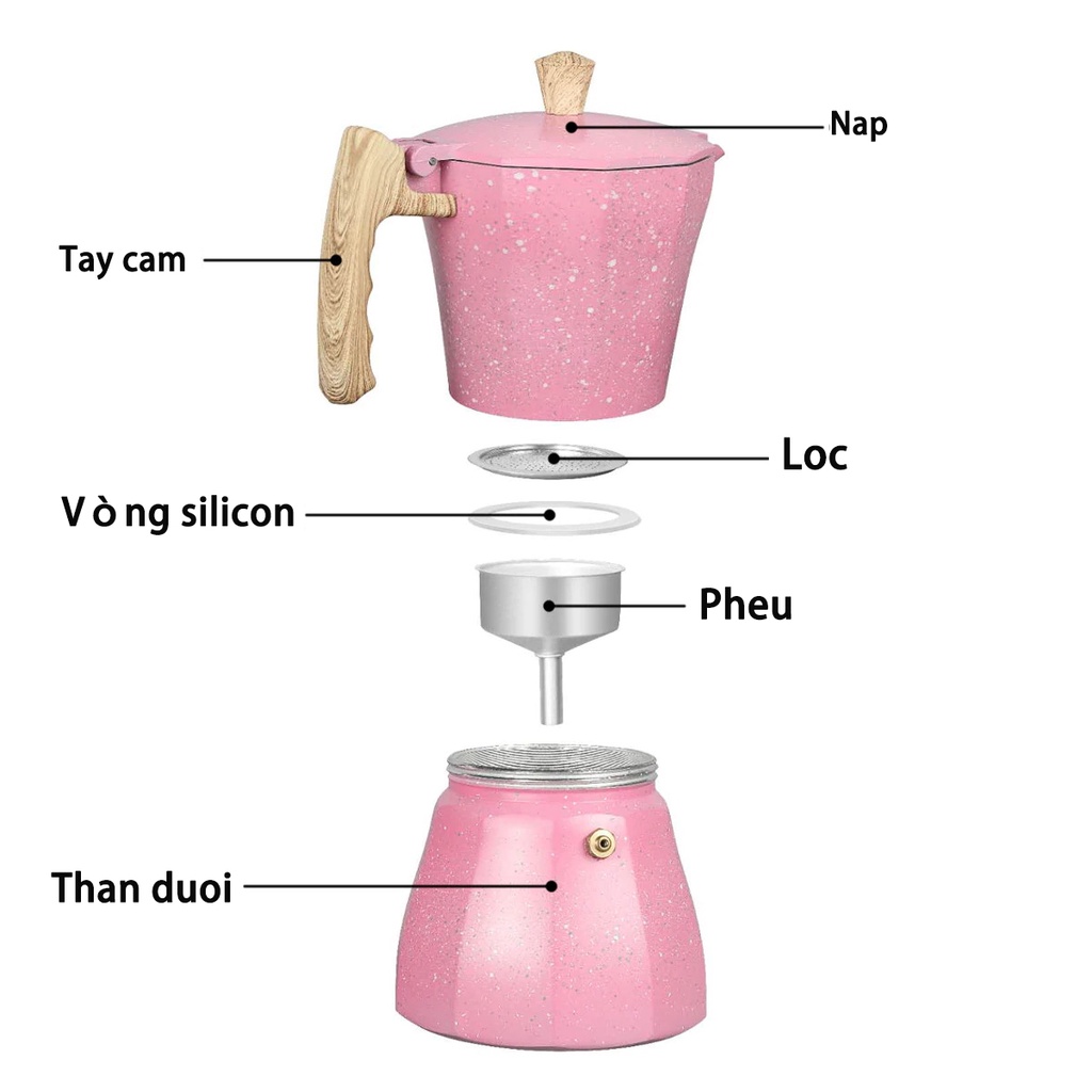 * Moka pot là một cấu trúc hai tầng, được bố trí ở phần dưới của nồi đun nước sau khi đun sôi, nó được trang bị bột cà phê của lưới lọc ở nửa trên của nồi.