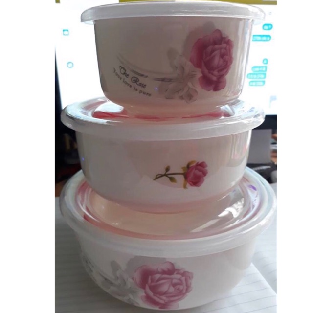 BỘ BÁT HOA HỒNG KHÔNG TAI 3 chiếc có lắp đậy, hút chân không sẵn hàngHàng chuẩn dùng được lò vi sóng thoải mái các bạn nhé