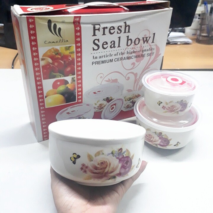 Nhà cửa & Đời sống > Bộ đồ bàn ăn > Lồng bàn || Bộ 3 bát lạnh sứ Camellia kèm nắp chân không bảo quản thực phẩmCòn hàng