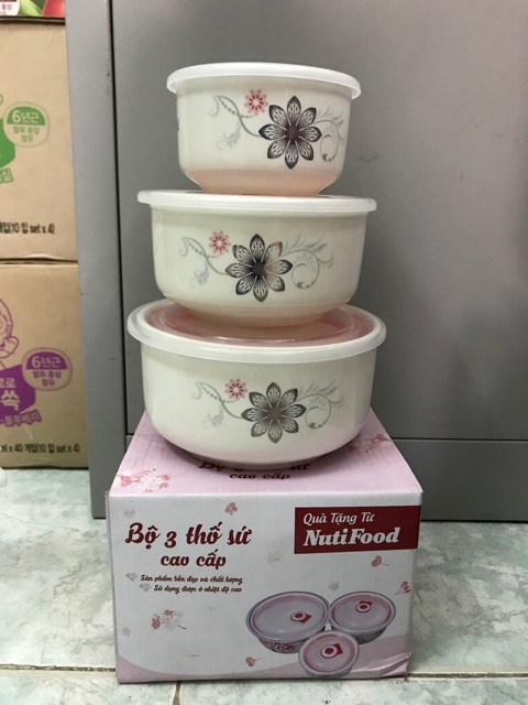 Gồm 3 bát kích thước khác nhau. Nắp bằng nhựa. Dùng được lò vi sóng