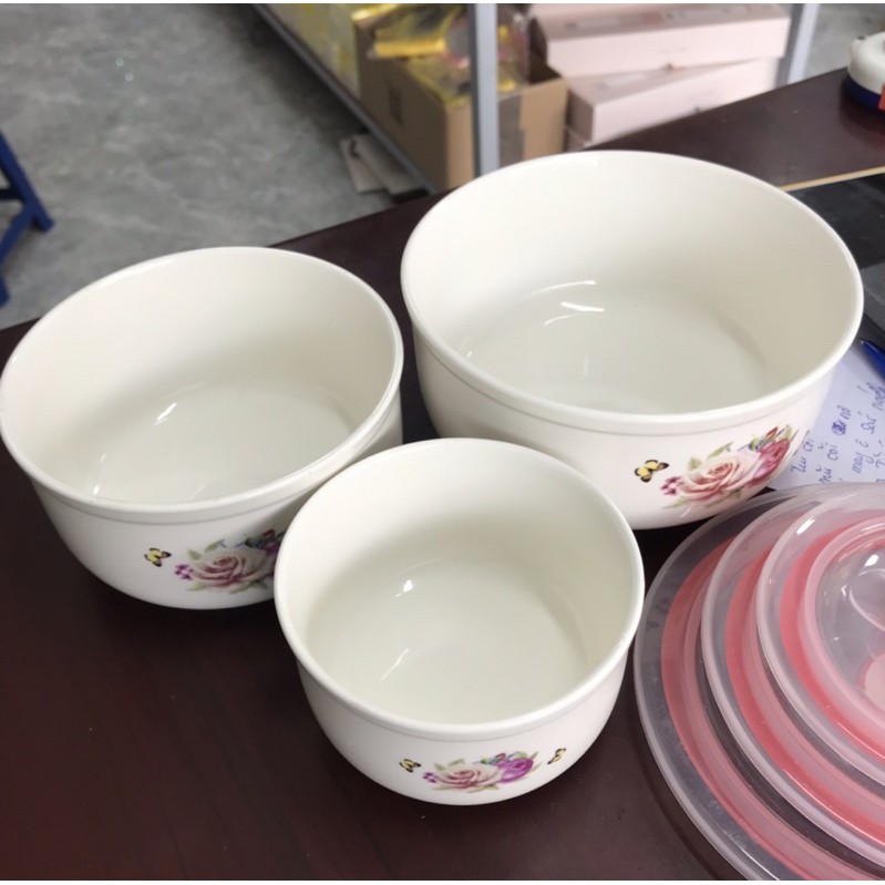 Bộ 3 bát sứ hình hoa - 3 kích thước từ nhỏ đến to - có lắp đậy hút chân không