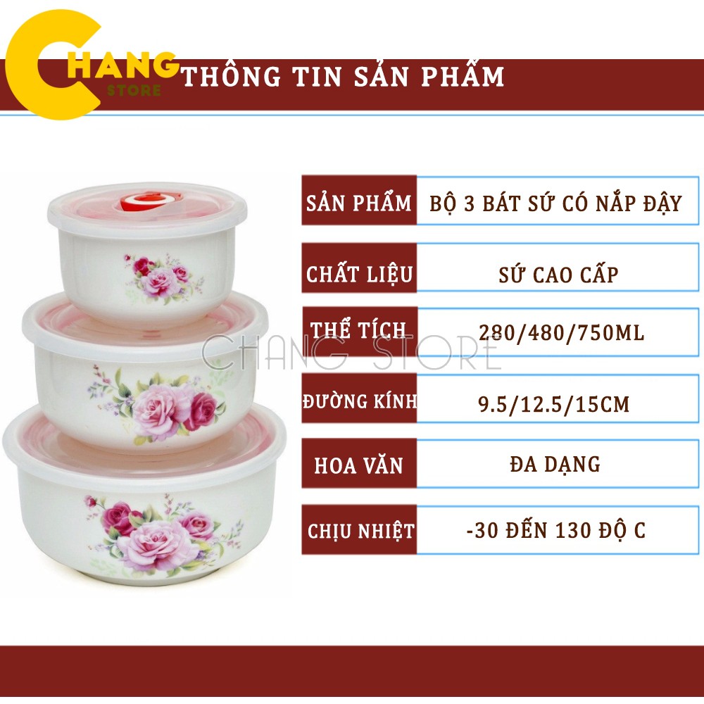 Bộ sản phẩm Bát sứ nắp hút chân không bao gồm: 3 chiếc bát bằng sứ trắng dầy, chất liệu cao cấp. Sản phẩm bền đẹp, có hoa văn in ngoài đẹp, sang trọng và rất đa dạng.