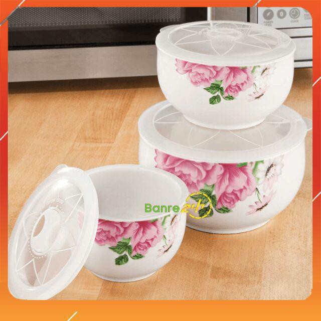 Bộ 3 bát sứ hút chân không nắp nhựa an toàn, sử dụng trong lò vi sóng, gốm sứ hoa văn đẹp.
