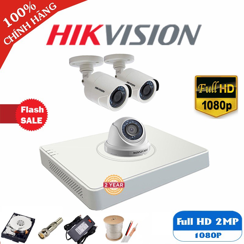 Bộ 3 Camera Hikvision Full HD 1080P - 2MP + Đầu ghi Full HD + Đủ phụ kiện để khách tự lắp