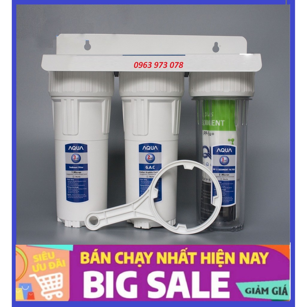 Bộ 3 cốc lọc thô 10in AQUA chính hãng, có giá đỡ và tay vặn
