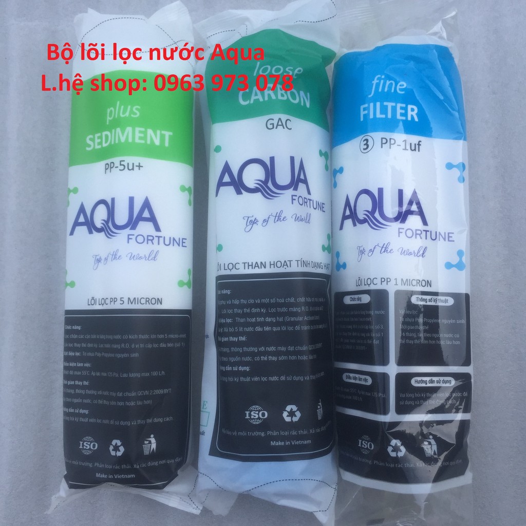 *Bộ 3 cốc lọc thô Aqua 10 inch dùng trong cho nước nấu ăn, sinh hoạt.*Bộ 3 cốc lọc nước sinh hoạt và ăn uống Thiết kế và cấu tạo: 3 cốc lọc thô gồm 2 cốc màu xanh và 1 cốc lọc trong 1 giá sắt treo 3 cốc đã lắp đặt sẵn 1 lõi lọc số 1 sợi bông PP khe hở 5 micromet 1 lõi lọc số 2 than hoạt tính dạng hạt 1 lõi lọc số 3 sợi bông PP khe hở 1 micromet và 1 tay vặn cốc chuyên nghiệp.