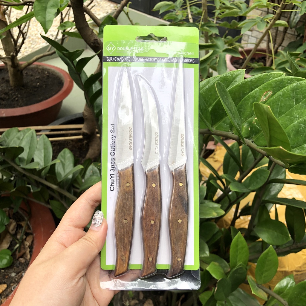 Bộ dao gồm 3 chiếc được làm bằng thép không rỉ, dài 2mm đảm bảo sáng đẹp, cán bằng gỗ chắc chắn.