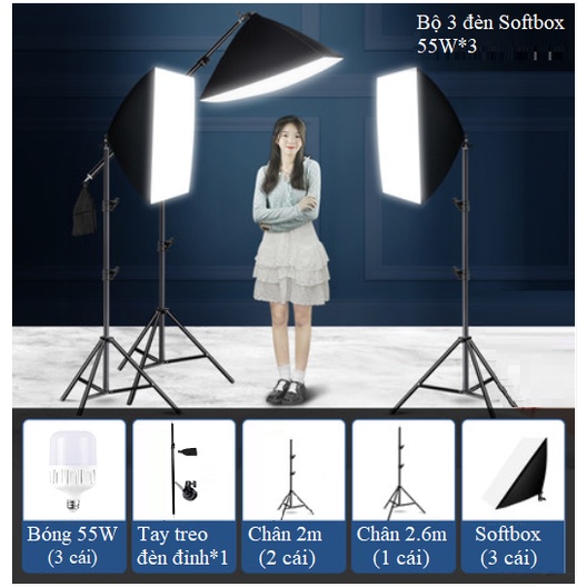 Bộ sản phẩm bao gồm: 2 chân đèn 2m, 1 chân đèn 2,6m, 1 tay treo đèn, 3 Softbox 50x70cm kèm dây nguồn, 3 Bóng đèn Led 55W