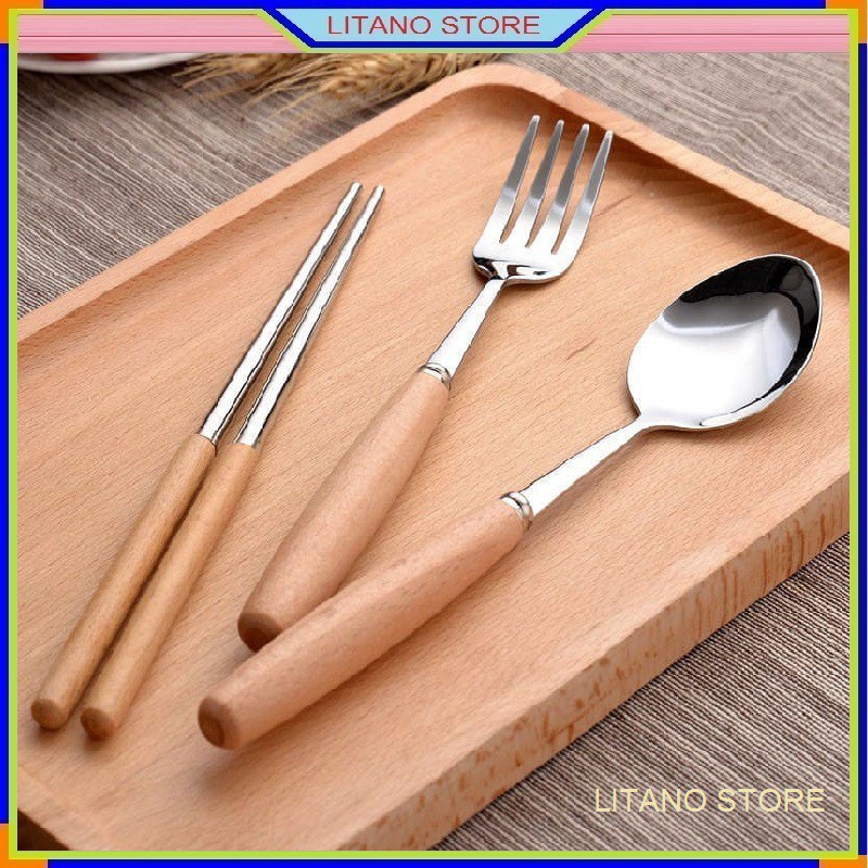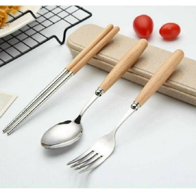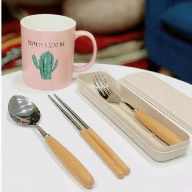 Nhà cửa & Đời sống > Bộ đồ bàn ăn > Dĩa || Bộ 3 Dụng Cụ Bàn Ăn Gồm Đũa, Thìa, Dĩa Inox Cán Gỗ Có Hộp Đựng Lúa MạchCòn hàng