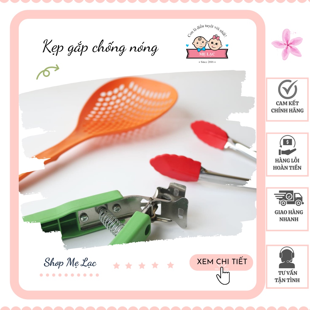 Mẹ Lạc có: Bộ 3 dụng cụ làm bếp tiện lợi, kẹp gắp thức ăn chín / muôi lỗ / kẹp chống nóng✔ Xuất xứ: Trung Quốc