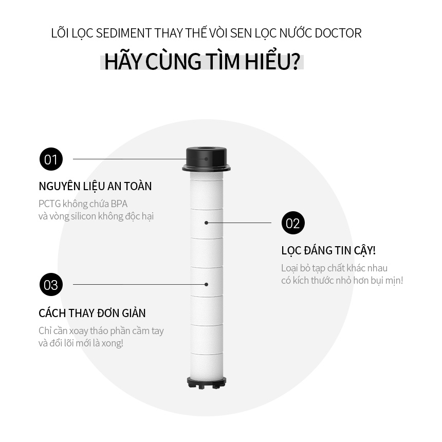 - Lõi lọc Doctor (lọc Sediment) loại bỏ các tạp chất dạng hạt khác nhau như bụi và rỉ sét, cũng như các chất lạ có kích thước nhỏ hơn bụi mịn.