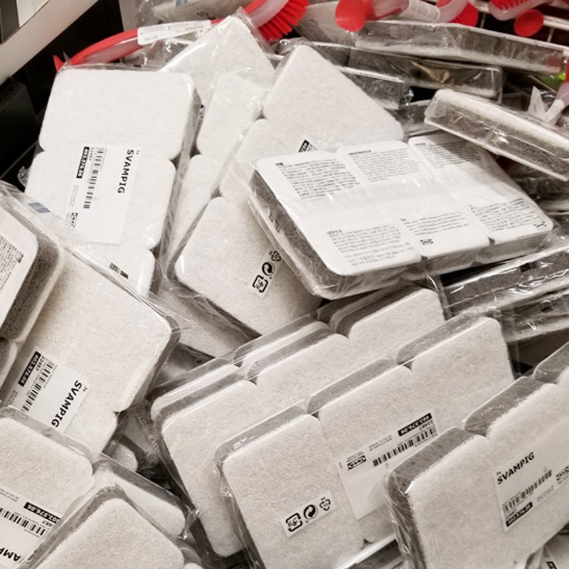 Bộ 3 mút rửa bát Ikea Svampig với cấu tạo phần trên: 50% polyester, 50% nylon; phần giữa: polyurethane, phần dưới: 80% viscose / rayon, 20% polypropylene.