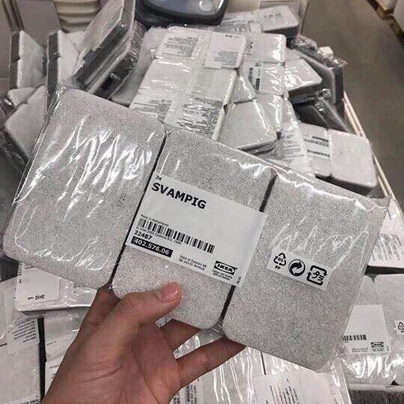 - Bộ 3 mút rửa bát Ikea Svampig với cấu tạo phần trên: 50% polyester, 50% nylon; phần giữa: polyurethane, phần dưới: 80% viscose / rayon, 20% polypropylene.