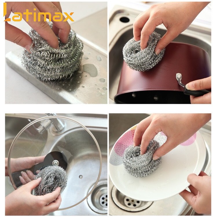 📍 Công Dụng : set gồm 6 miếng, mỗi miếng gồm các sợi inox bao lấy nhau, giúp vừa lau chùi vừa cọ rửa các vết bẩn bám dính trên xoong, nồi đồ dùng nhà bếp
