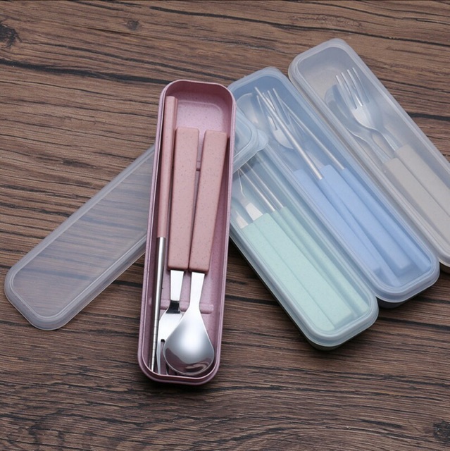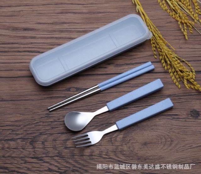 Bộ 3 món Muỗng, Đũa, Nĩa, INOX 304 Mạ PVD, có hộp làm từ nhựa sinh học lúa mì