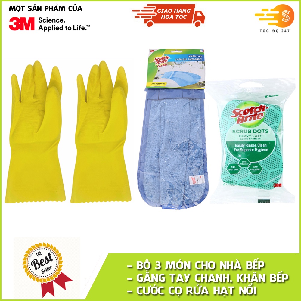 Nhà cửa & Đời sống > Dụng cụ chăm sóc nhà cửa > Khăn vệ sinh || Bộ 3 món nhà bếp gồm khăn lau chén dĩa, găng tay rửa chén hương chanh và 2 miếng cước hạt nổi siêu sạch Scotch-Brite 3MCòn hàng