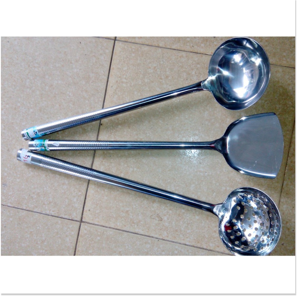 Bộ 3 muôi canh, xẻng xào, xẻng lật inox size đại dành cho bếp ăn tập thể, nhà hàng, khách sạn