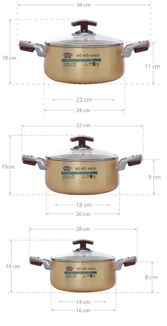 👉Đa dạng kích cỡ, phù hợp nhiều mục đích sử dụng: Bộ gồm 3 nồi Anod với những kích cỡ phổ biến 16cm – 20cm – 24cm, đáp ứng nhiều mục đích sử dụng khác nhau trong gia đình (nồi nhỏ 16cm thích hợp để luộc trứng, kho thịt, nồi cỡ trung 20cm để nấu canh cho 3-4 người và nồi lớn 24cm có thể luộc gà, nấu canh hoặc lẩu cho 3-5 người).