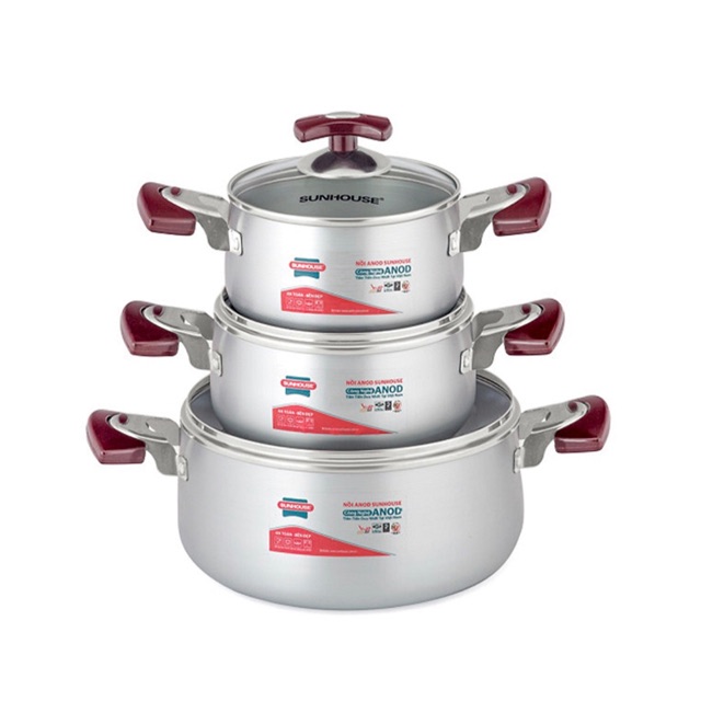 Bộ 3 Nồi Anod Vung Kính Sunhouse SH6633-20 Trắng Bạc (16cm, 20cm, 24cm)