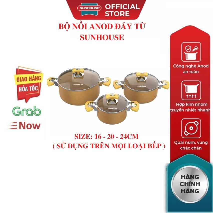 Bộ 3 Nồi Bếp Từ Anod Sunhouse 16cm 20cm 24cm Siêu Dày (dùng được trên mọi loại bếp) Chính Hãng Bảo Hành Toàn Quốc