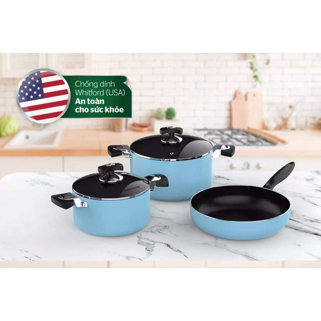 - Bộ sản phẩm gồm 2 nồi với đường kính 20 và 24 cm và 1 chảo 26 cm phù hợp với nhu cầu nấu nướng của mọi gia đình. Nồi cỡ vừa 20 cm để nấu canh cho 2 – 4 người và nồi lớn 24 cm có thể luộc gà, nấu canh hoặc lẩu cho 3 – 5 người. Với chảo sâu lòng kích thước 26 cm, bạn có thể xào thực phẩm và chiên ngập dầu, rán cá nguyên con.
