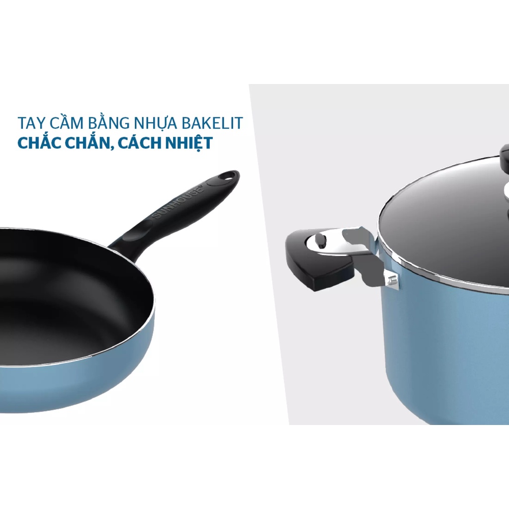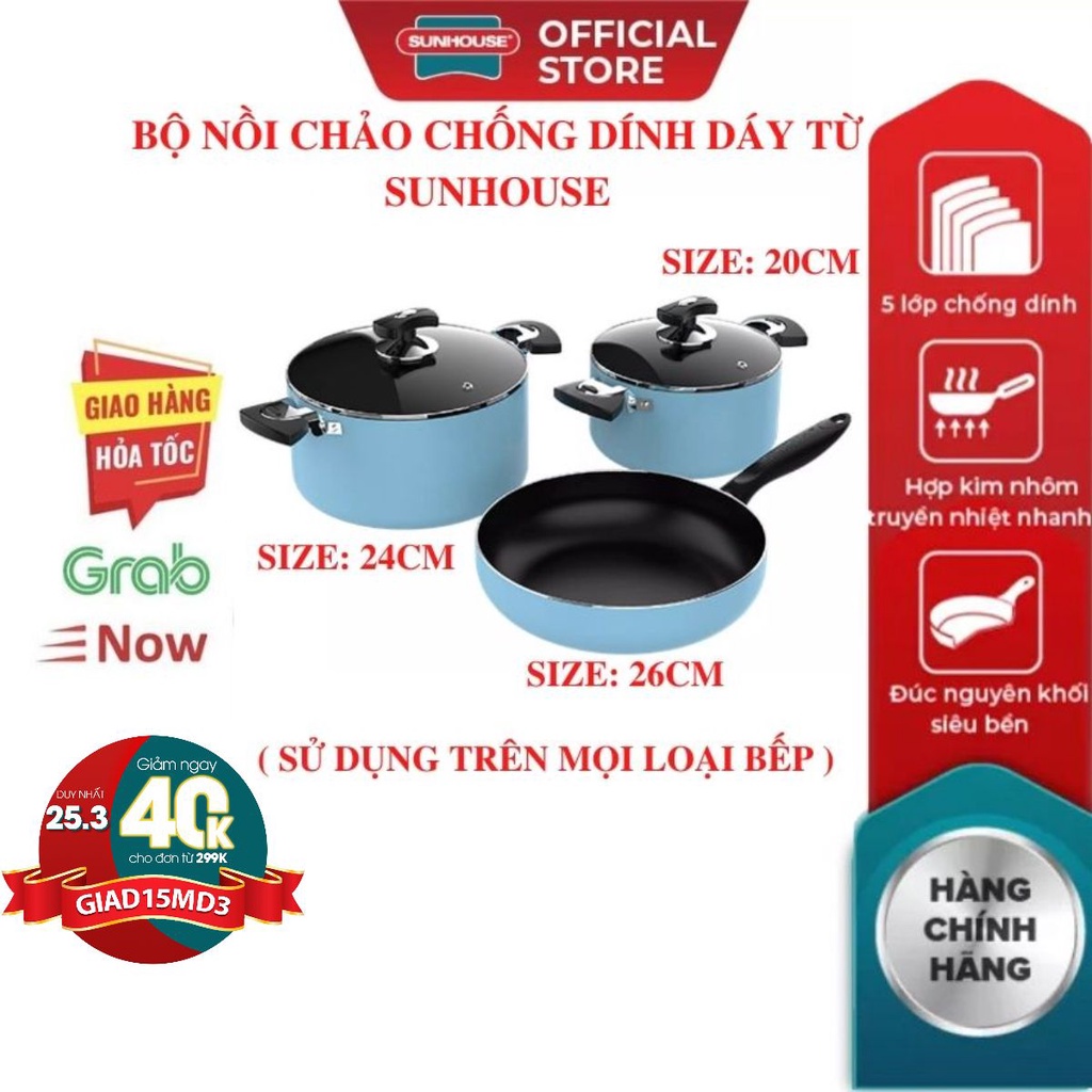 Bộ 3 Nồi Chảo Chống Dính Bếp Từ SUNHOUSE 20cm 24cm 26cm (dùng được trên mọi loại bếp) chính hãng bảo hành toàn quốc