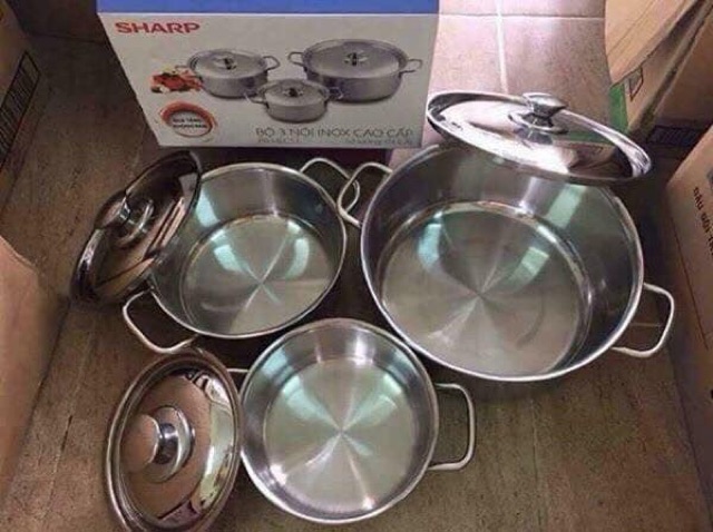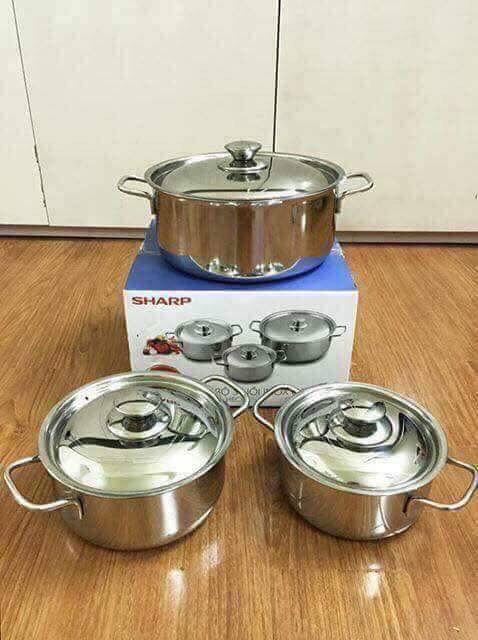 - Bộ 3 nồi Inox Sharp có khả năng chống oxy hóa cực tốt, chống cháy khét, dễ chùi rửa, bảo vệ sứa khỏe cho người thân và gia đình. Đáy nồi 1 đáy giúp thu nhiệt nhanh, tỏa nhiệt đều, giữ nhiệt lâu, tiết kiệm gas, thời gian nấu