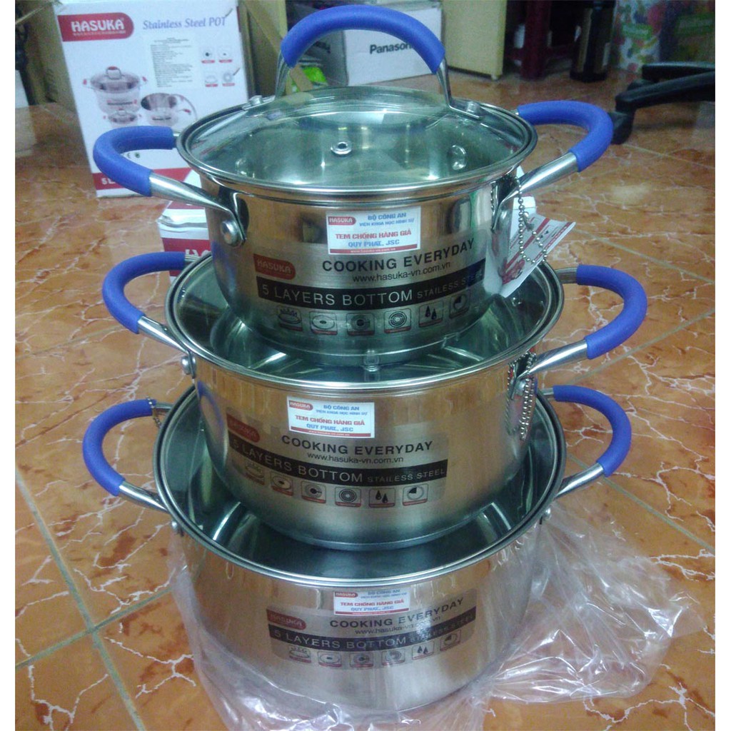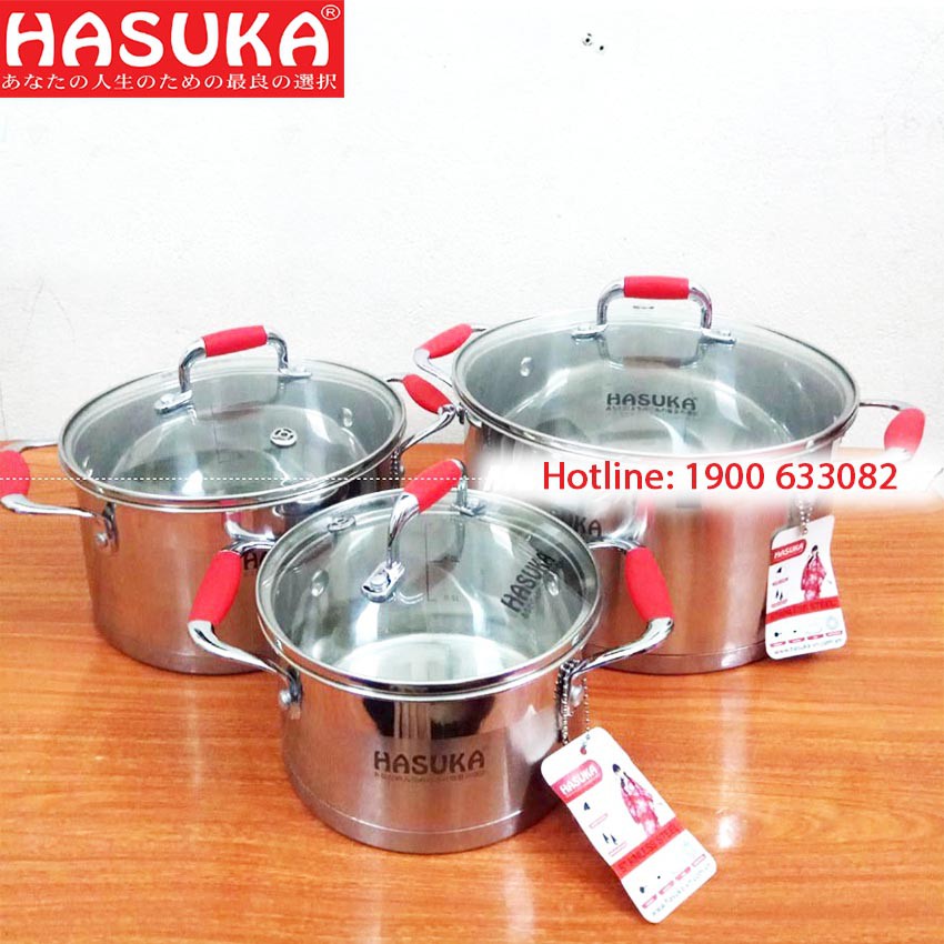 Bộ 3 nồi Inox 16 - 20 - 24cm Hasuka nắp kính dùng bếp từ