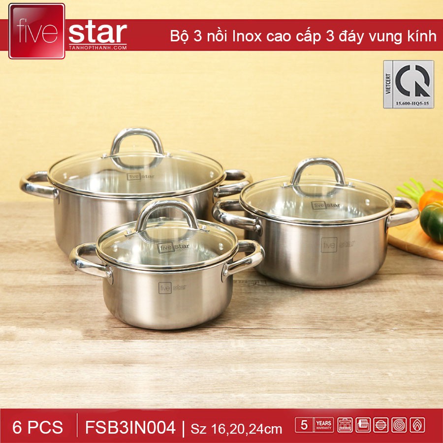 Bộ 3 nồi inox 3 đáy nắp kính Fivestar FSB3IN004 dùng bếp từ (16cm, 20cm và 24cm) bảo hành 5 năm